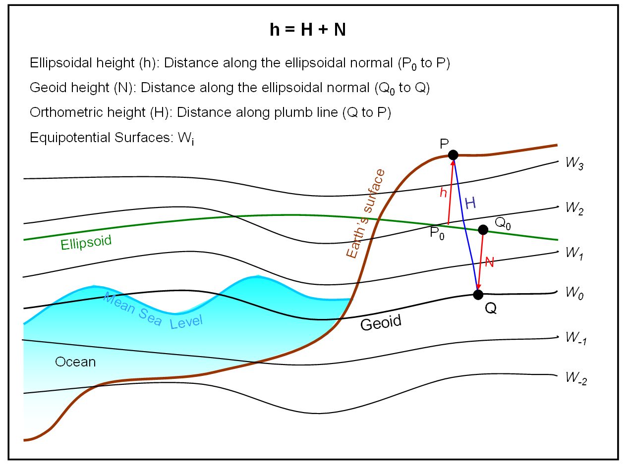 Orthometric height (H): Elevation of a point above the geoid. It is measured along the plumb line, which is perpendicular to the equipotential surfaces. (Unit: m)