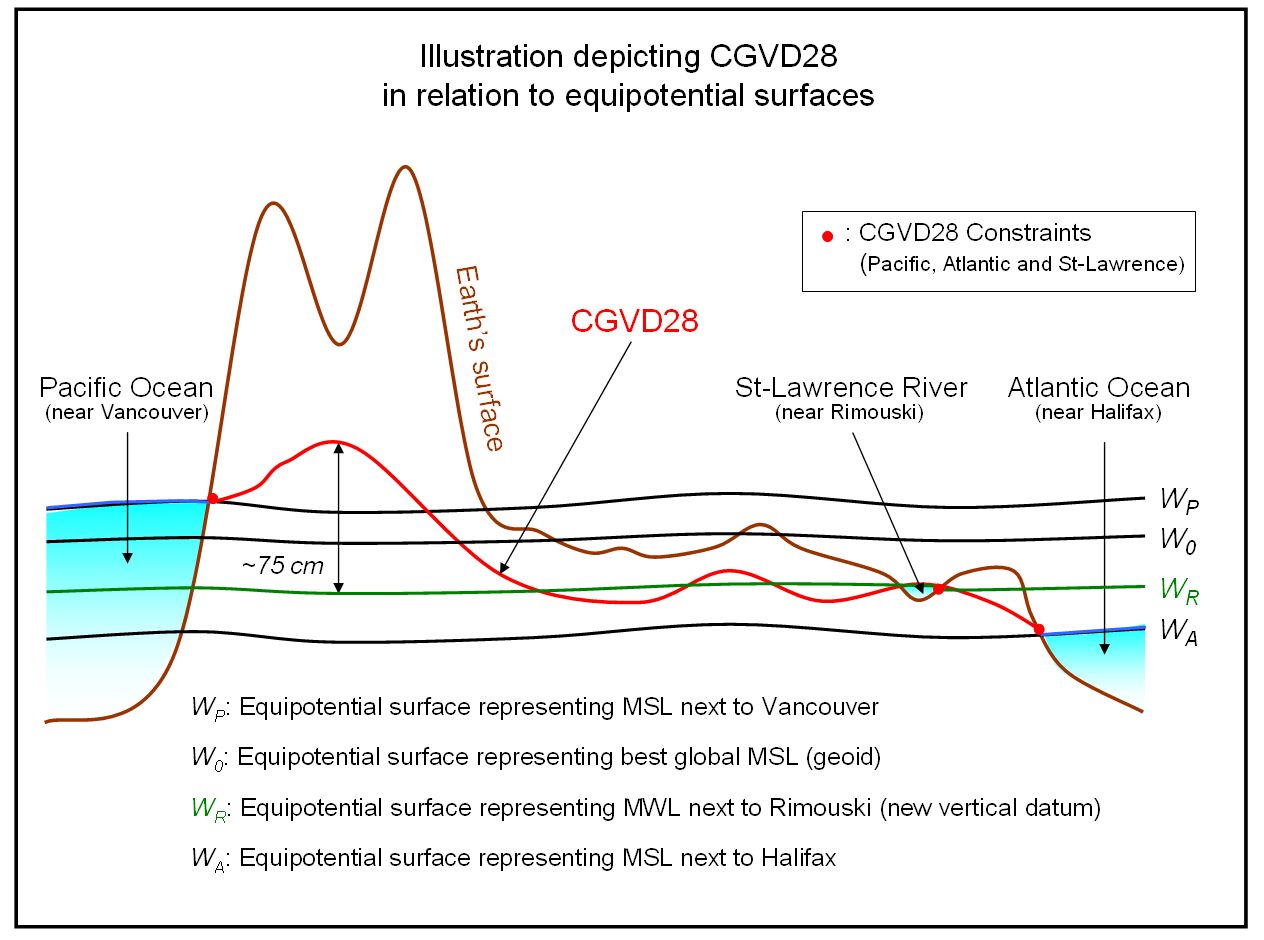 Vertical Datum: It is the reference surface for a height system, i.e., it is the zero elevation. The vertical datum is not necessarily an equipotential surface (e.g., CGVD28, ellipsoid and telluroid). A vertical datum is made of two components: a reference system and a reference frame. The former is its definition while the latter is its realization.