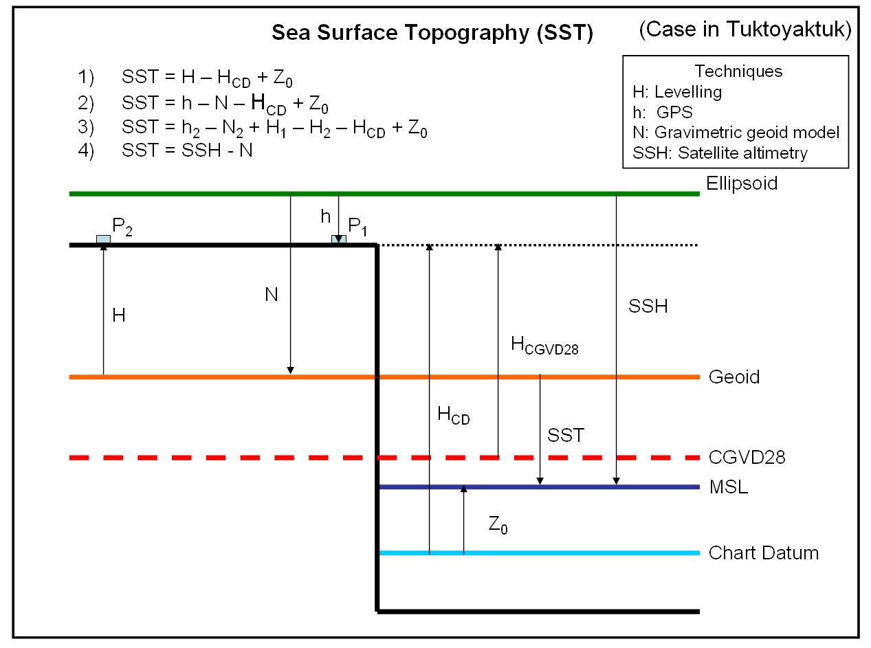 Sea Surface Topography (SST): It is the separation between the geoid and ocean surface. SST can be determined from Sea Surface Height (SSH) measured from satellite radar altimetry and a geoid height (N): SST = SSH - N. SST is positive if the ocean surface is above the geoid. It is equivalent to the orthometric height of the ocean surface. (Unit: m)