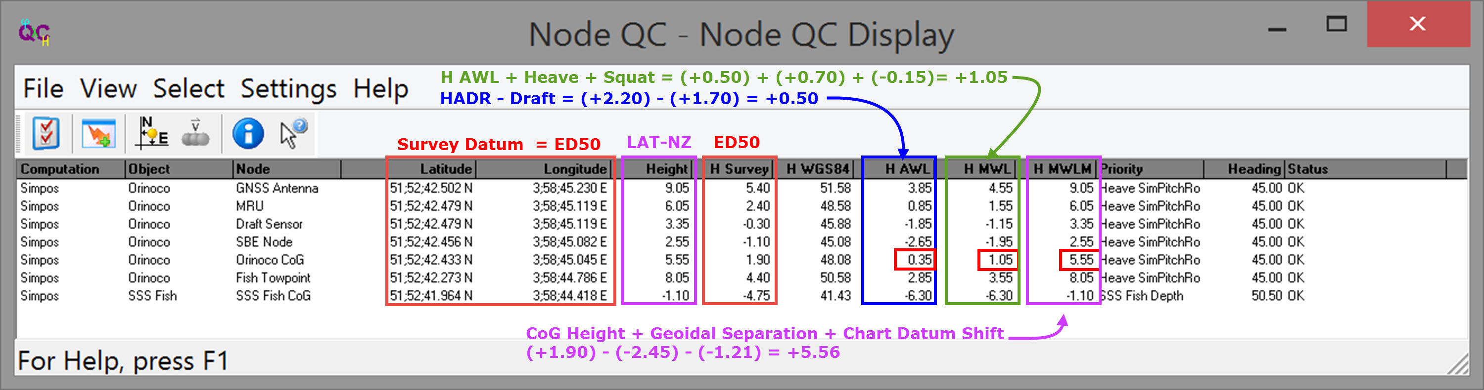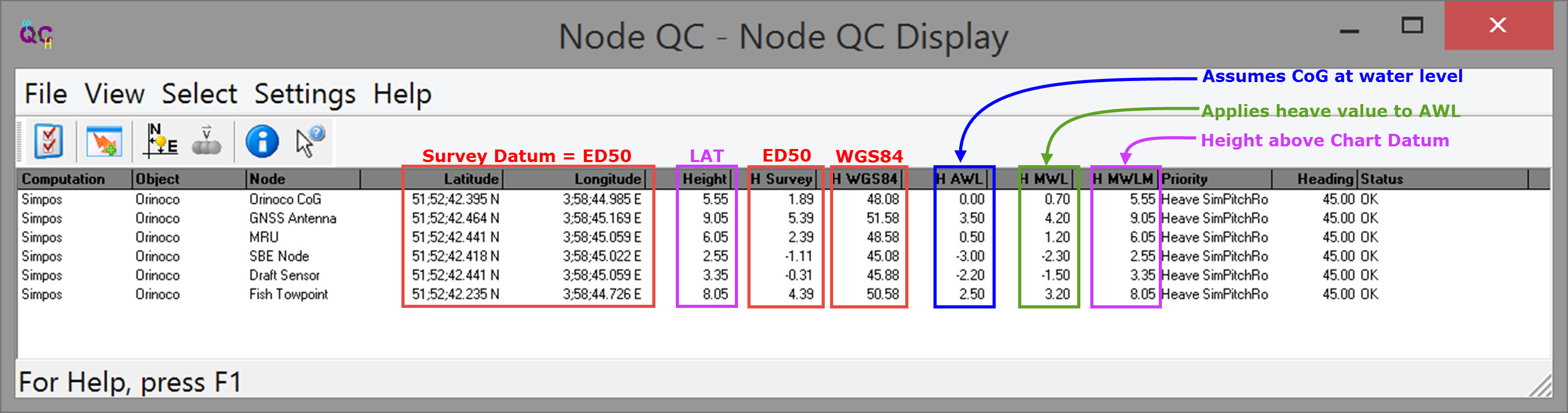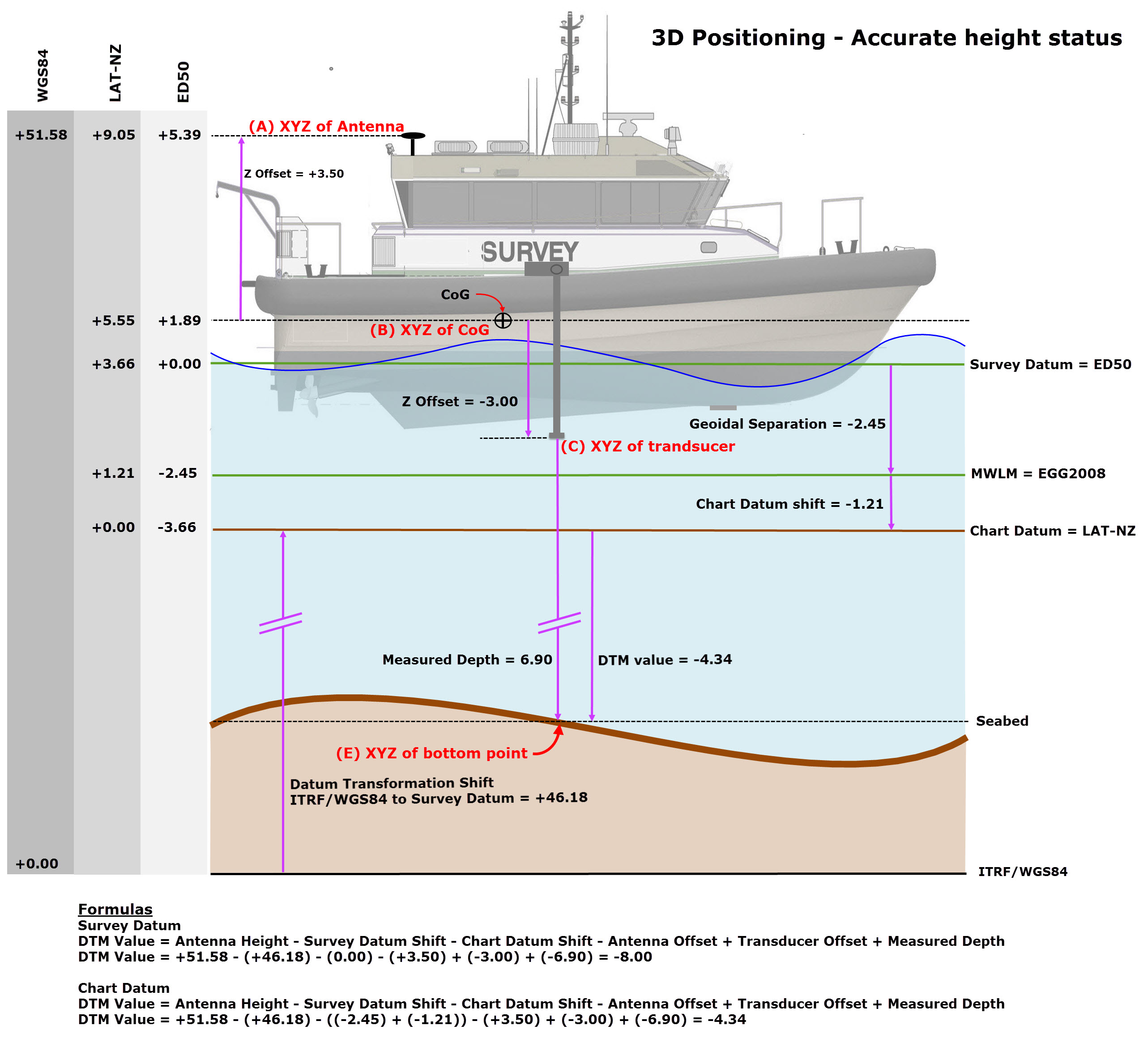 Height | Value in survey units of the Height Aided Observation, which is calculated by the Height Aiding driver. The Height value is by default referenced to the Vertical Datum (also known as Chart Datum), but, alternatively, either Survey Datum or datums like WGS84, ETRS or ITRF (which all use the GRS 1980 ellipsoid) may be selected. Notice that this value is the same as the height of the reference node for the selected vessel. Datum: