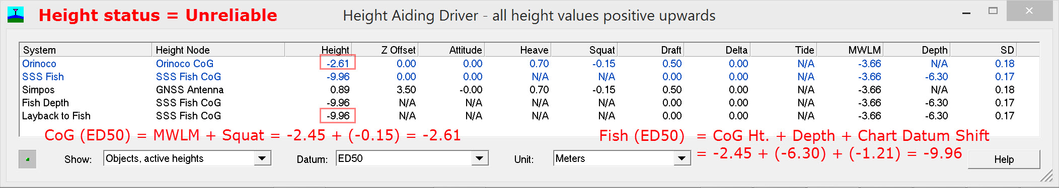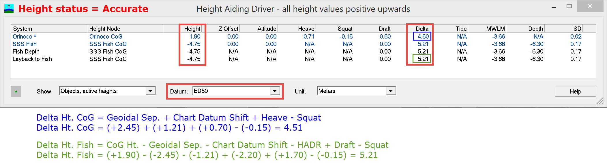 Delta Ht. Fish = Accurate Height - Unreliable Height = -4.75 - (-9.96) = +5.21 (as shown in the HAD window with Height Status = Accurate)