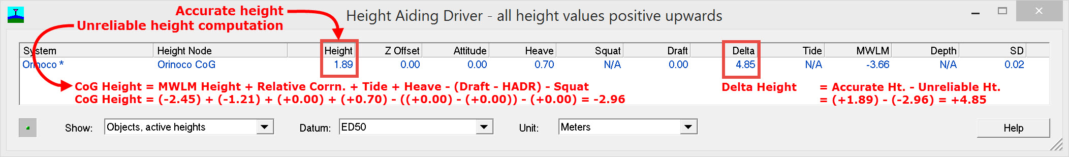 Delta Ht. CoG = Accurate Height - Unreliable Height = 1.90 - (-2.61) = +4.51 (as shown in the HAD window with Height Status = Accurate)