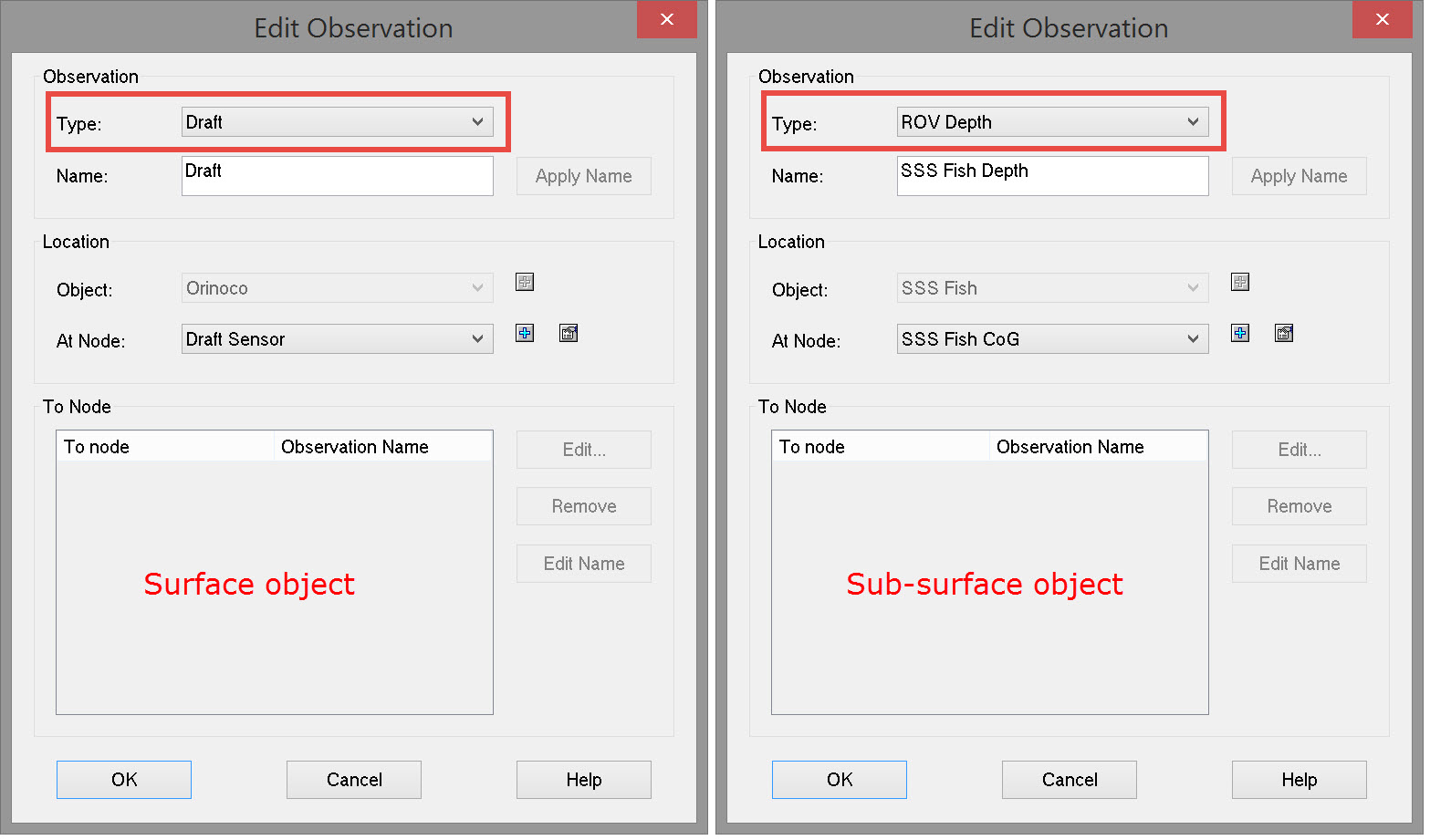 - Define an underwater sensor system ('Draft' observation) on the surface object.