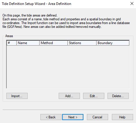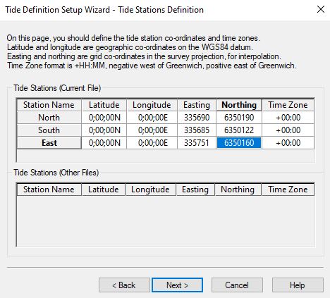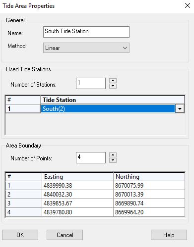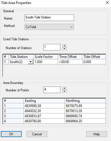 This will show the Tide Stations Definition page. - On this page the station grid coordinates can be entered. For the Area method, only grid coordinates are used.