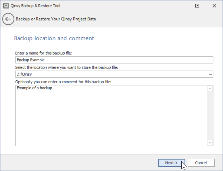 In the Qinsy Backup & Restore Tool dialog box choose to backup or restore data, depending on what you would like to do, and select "Next >" (see Figure 2).