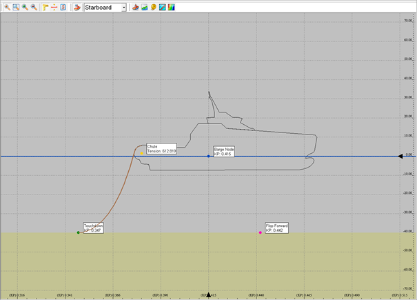 The Profile Display shows the catenary, the touchdown point, the chute node on board of the vessel, the barge node and the flop forward point including their KP values.