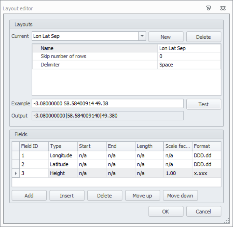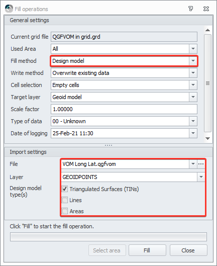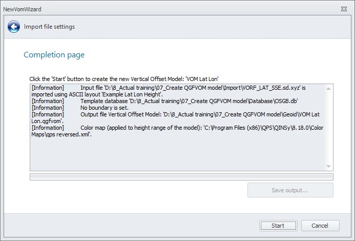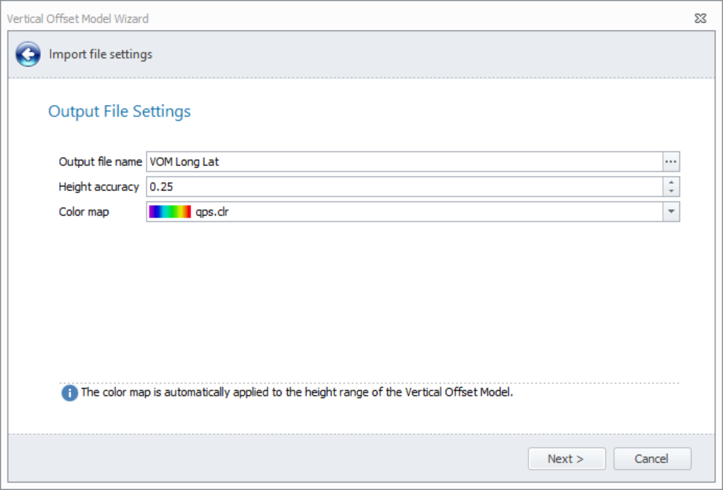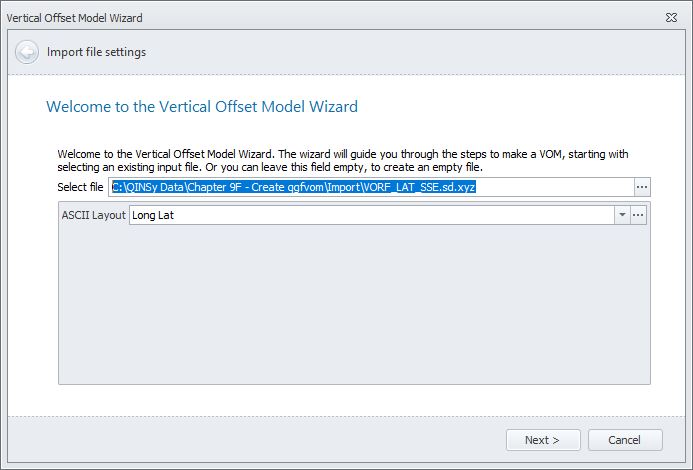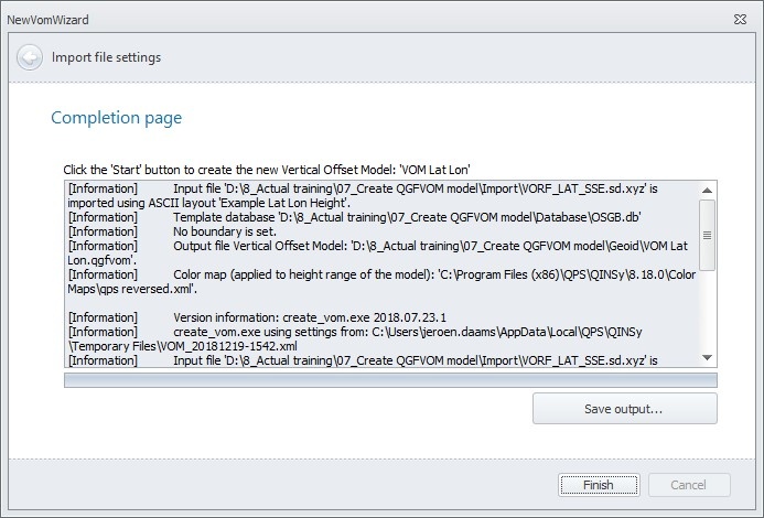 The data as it will be stored in the VOM file will be shown in the 'Output' field.A Vertical Offset Model (QGFvom) consists of Easting, Northing, Height Correction and therefore the imported Lat Long data needs to be converted.
