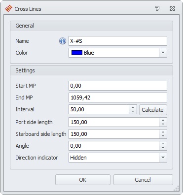 Press the option 'Cross lines' and the Cross Lines dialog opens, where you can enter the settings for creating cross lines along the selected line/polyline: