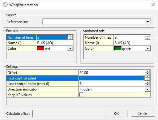 The Wingline creation dialog opens, where you can enter the settings for creating lines to port and starboard of the selected line/polyline: