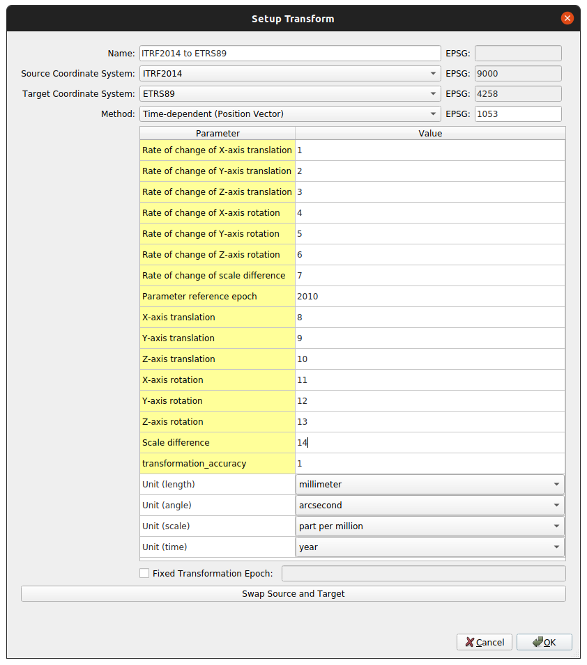| Parameter reference epoch | The reference epoch t0 must be defined when a Time-dependent Transformation has been selected. In this example, 2010.0. |