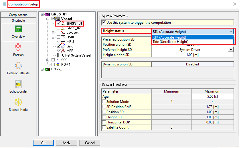 If we have observations that give heights with respect to mean sea level, e.g. when using ROV bathy units, then we only use the height aiding driver and select the Chart Datum to be the Survey Datum. But if we want to improve the height results from the adjustment computations, e.g. when using DGPS, then we (can) use both the height aiding driver, to add more height information, and the Chart Datum, to apply a height offset to the results.