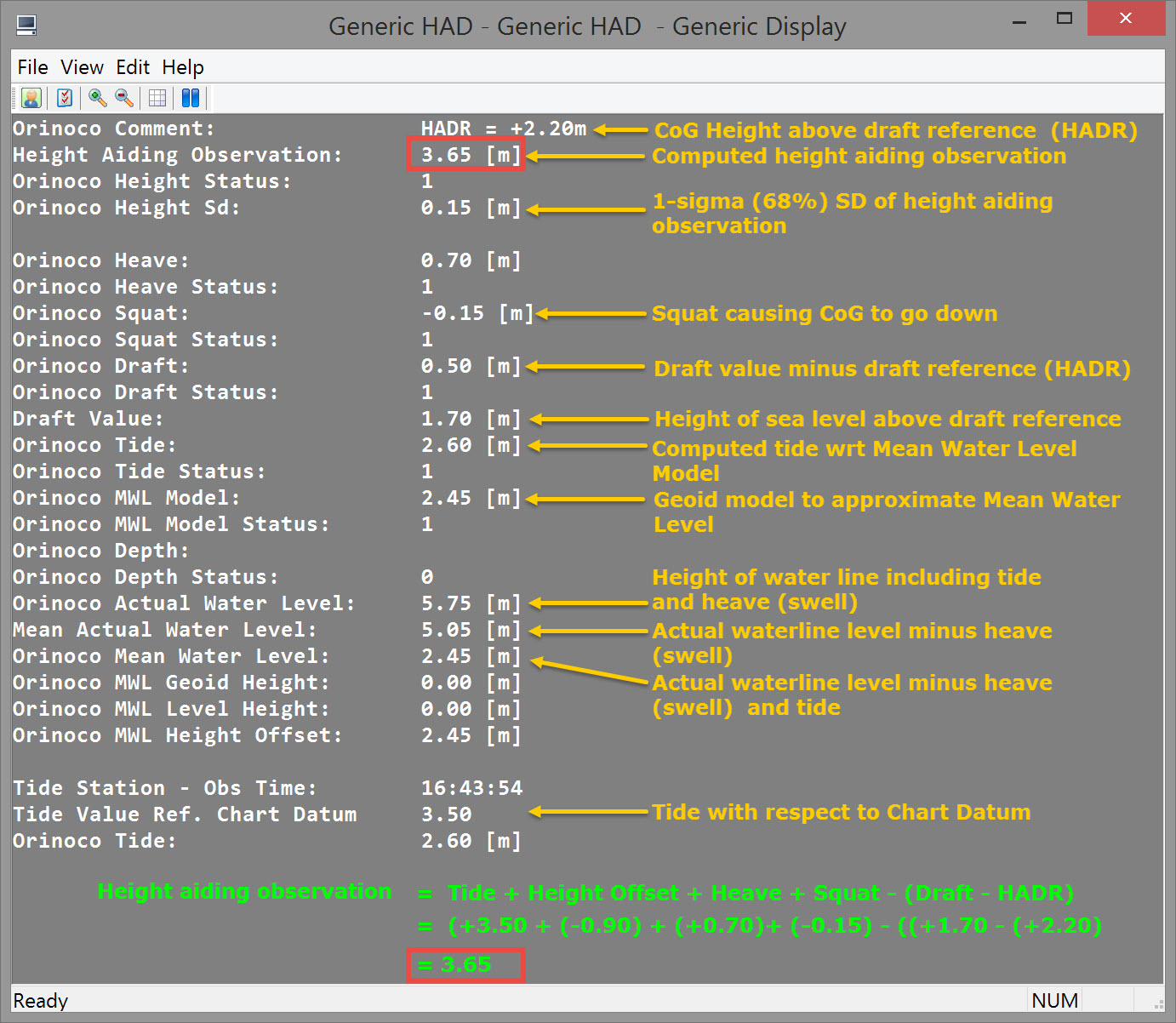'Height Aiding' means to “aid” the computation of the 'height' of a node position by adding an additional observation, i.e. the height aiding observation, to the adjustment in which the node position is determined. Height aiding is typically required when the height component of position is insufficiently accurate for the particular survey purpose. For example, DGPS is not usually accurate enough for precise bathymetry. Height aiding is also used in computing position of an underwater object (towed fish/ROV) when observation(s) relative to water level are available, e.g. ROV depth, even when the 3D positioning of the surface vessel itself is accurate to centimeter level.