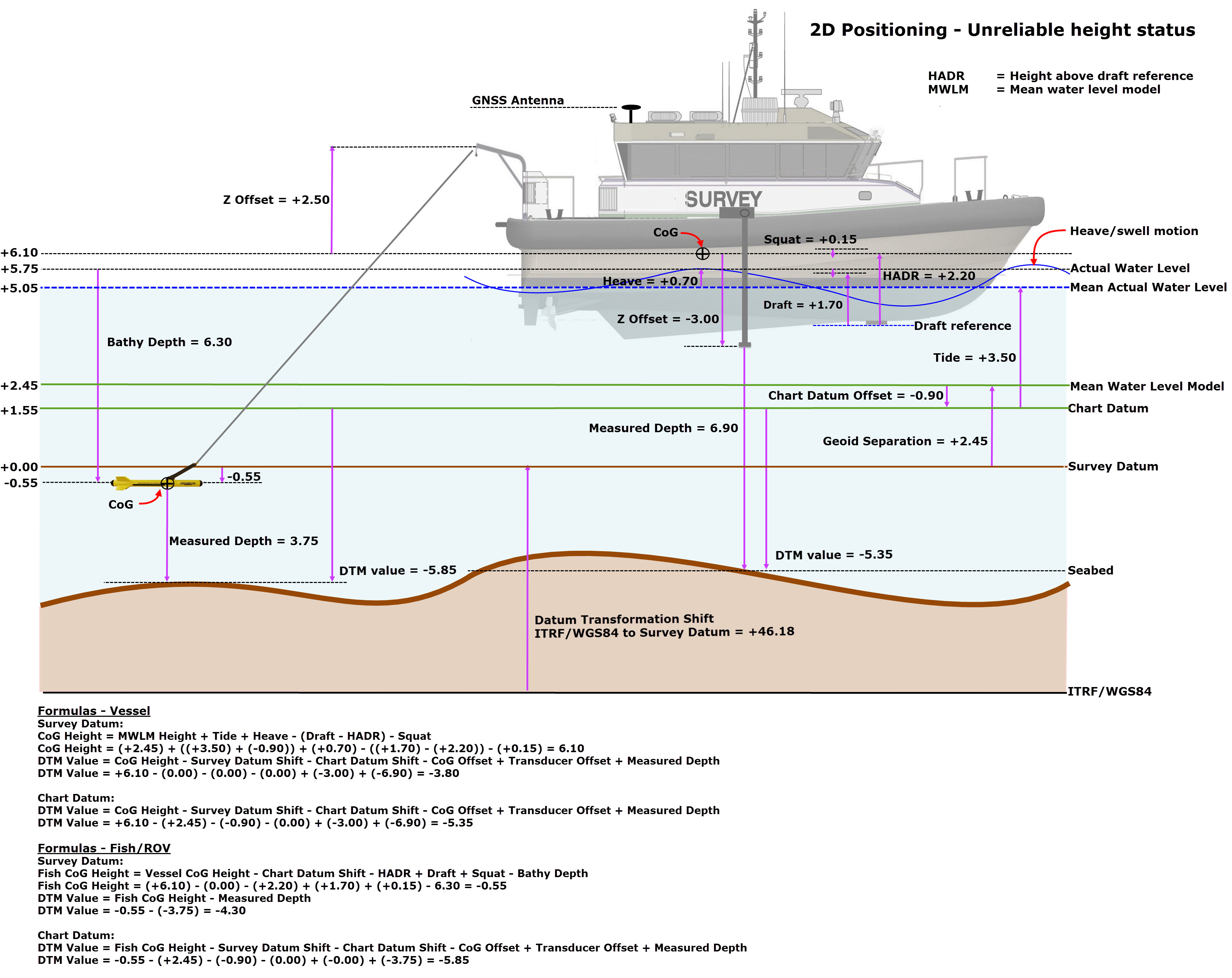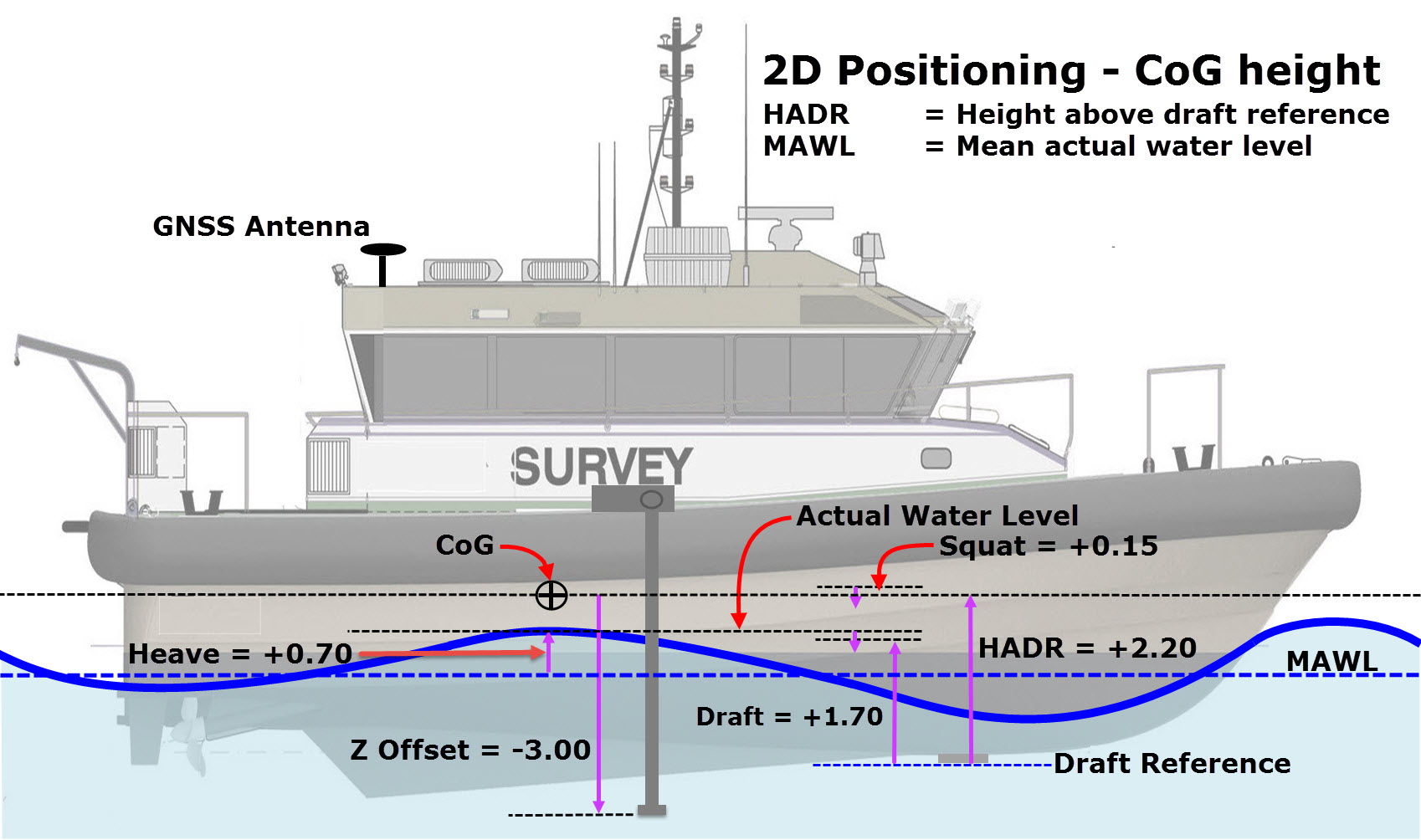 Because the height of the GNSS is not used, a different height level or height reference is needed, as indicated above. For 2D positioning Qinsy makes use of a "Mean Water Level Model" as height reference. CoG is assumed to lie at the water line with an assumed height of zero.