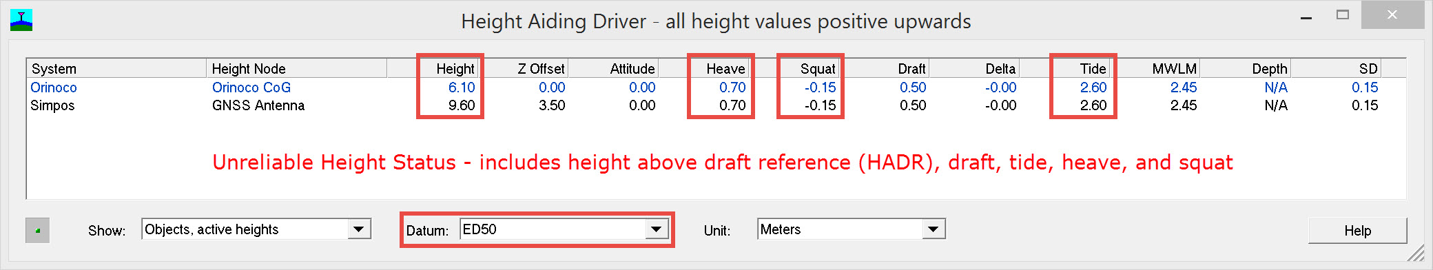 With an 'unreliable' height status and with the usual height aiding components, HADR, draft, tide, heave and squat enabled, the Height Aiding Driver window contains the following values: