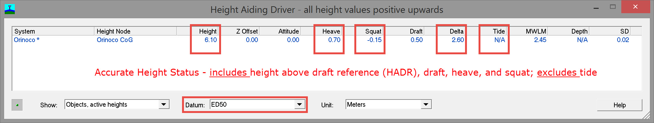 Continuing with the example scenario used above, height status is set to 'accurate' and no HADR, draft, tide, heave or squat observations are enabled. The Height Aiding Driver window looks like this: