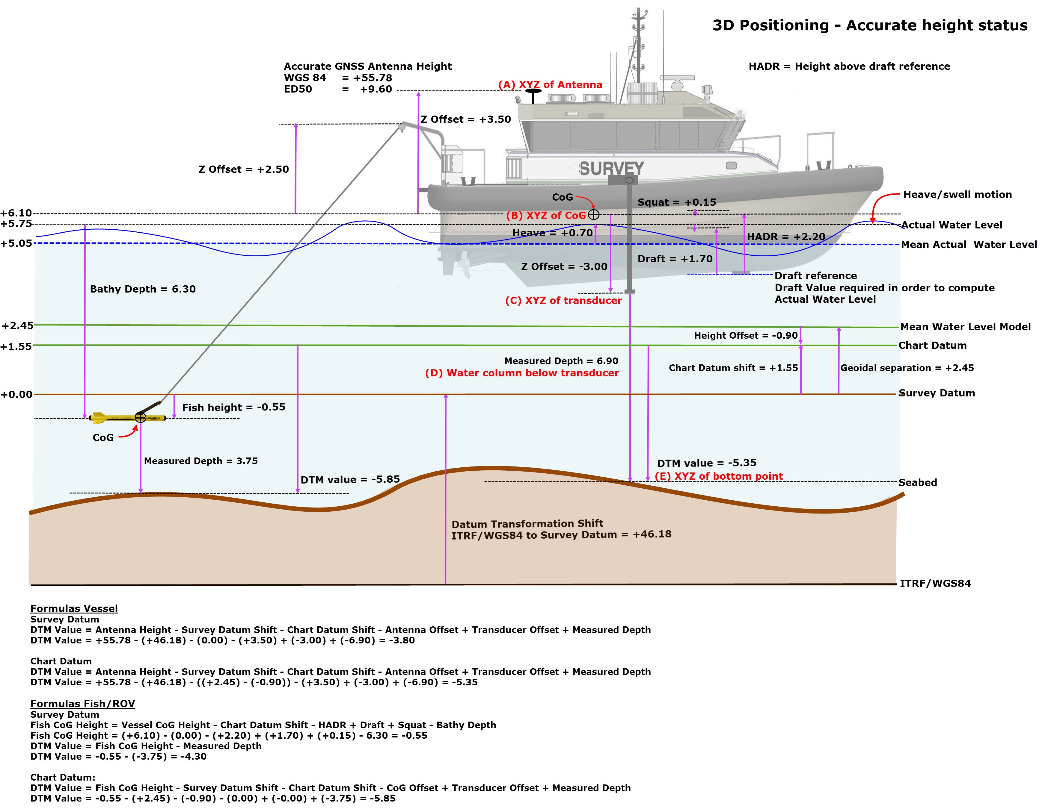 Now we know the position and height of the CoG, we also know the height of the echosounder tranducer (see 'C') (and all other sensor offsets) relative to the local datum.