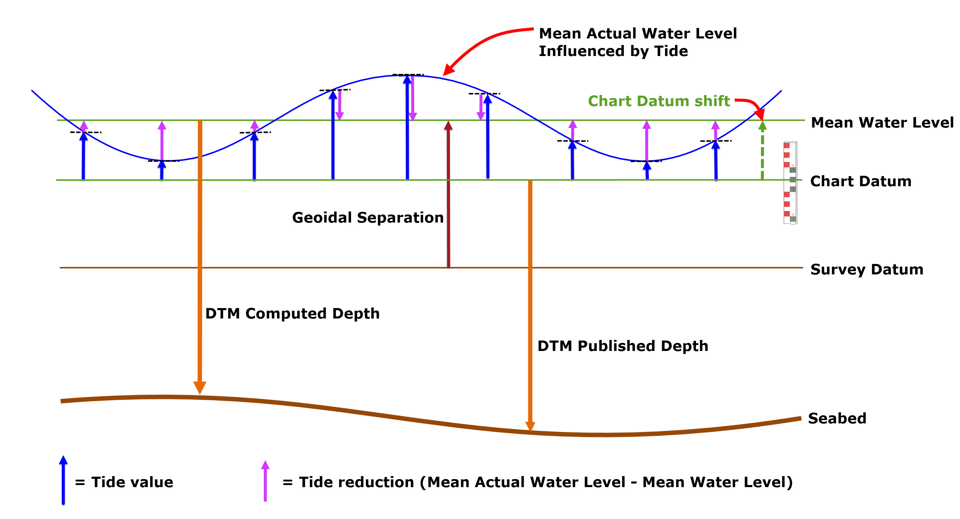 Therefore, in order to reduce tide correctly, it is important to know which vertical datum tide values are referenced to, and, if that vertical datum does not correspond to MWLM, it is necessary to know the 'chart datum shift' from MWLM so that a relative correction may be applied.