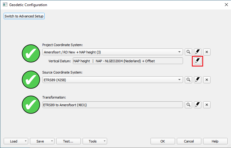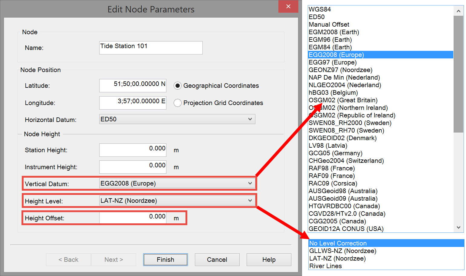 In the example EGG2008 (Europe) is selected as the Vertical datum, and the relative height correction model is LAT-NZ (Noordzee).