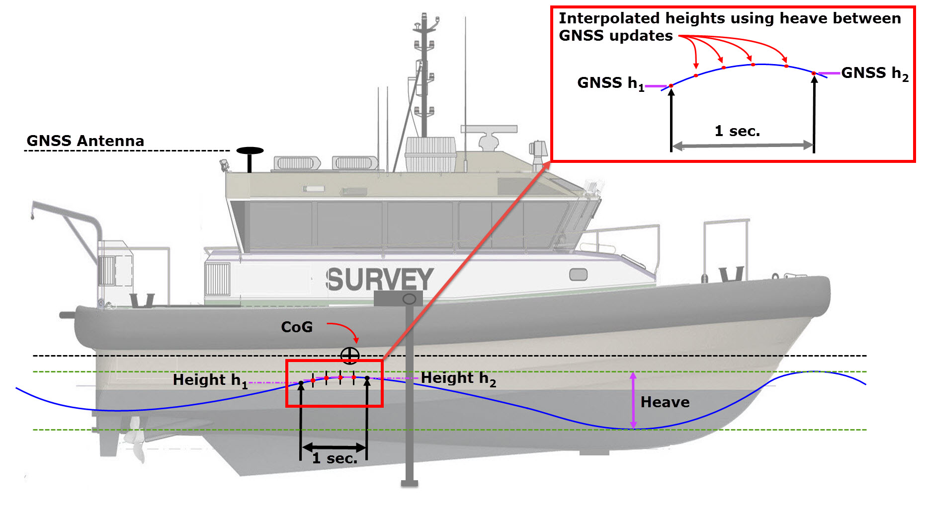 Many GNSS systems update position at only 1 Hz. In order to calculate height of the CoG at a higher frequency than position updates the heave observation from a motion sensor is used. Heave values are only used to calculate the height of the CoG between two position updates (see Real-time Height above)..