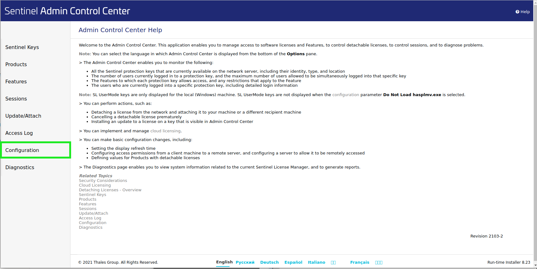 Administrators may copy a suitable configuration file to the client machine. Users may apply changes to the file on their local machine by using the Sentinel Admin Control Center.