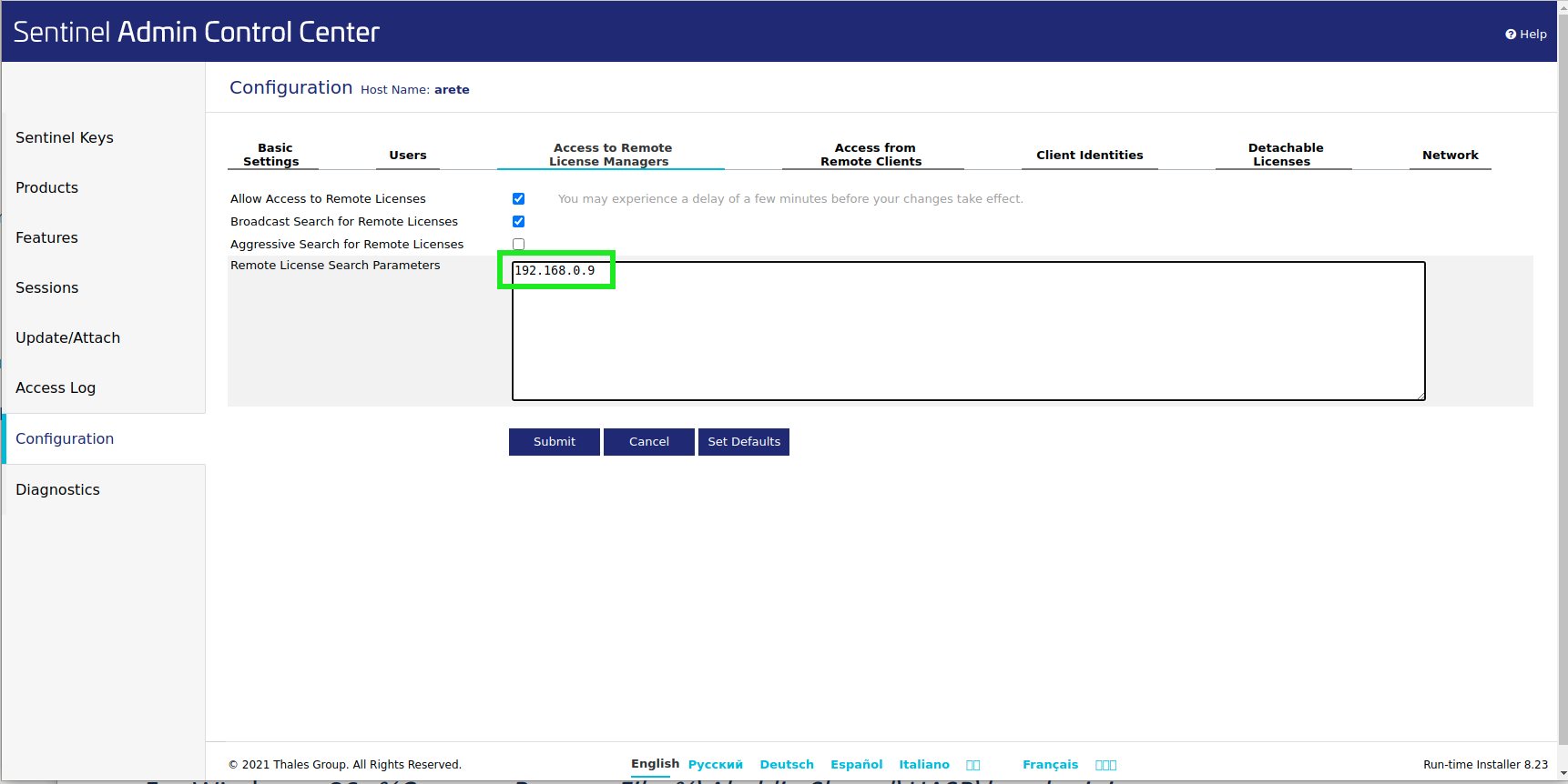 On the next screen, fill in the IP address of the machine with your NetHASP dongle in the box labelled Remote License Search Parameters.