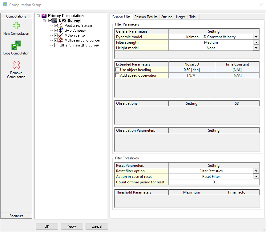 Position filters: Under this tab filters can be selected to smooth the track of the positioning, using a Kalman Filter. More information can be found in the How-to Smooth Vessel or ROV Track .