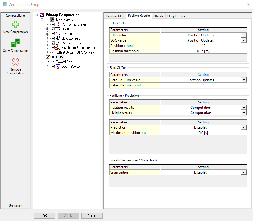 Position filters: Under this tab filters can be selected to smooth the track of the positioning, using a Kalman Filter. More information can be found in the How-to Smooth Vessel or ROV Track.