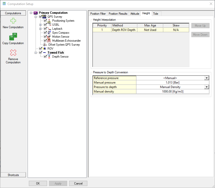 Height: Under this tab the settings for the Height interpolation and the settings for the Pressure to Depth Conversion (When a pressure sensor has been added to the object in the template database) can be found here.