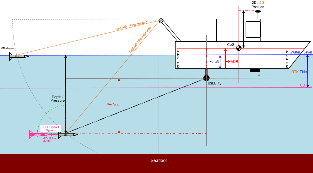 USBL dX,dY and Depth (relative to Water Line) or Depthcorrected for tide = DepthCD (Depth relative to Chart Datum) or a -Height (a setting since 9.4.1)