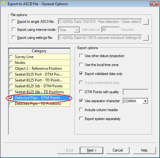 This will start the ASCII export wizard. Select the category to export: detected pipe-DTM points.
