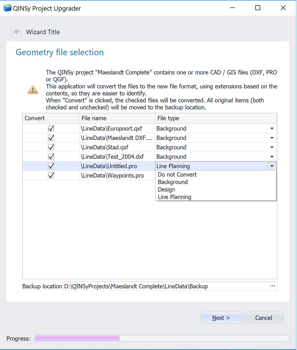 The Geometry Upgrade Wizard opens, when old or third party CAD files are located in either the LineData or DxfToQxf folder, meeting the following criteria: