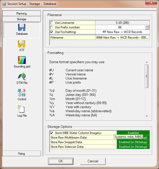 The storage of Water Column data can be activated by the user but the raw Snippet and multibeam data storage are enabled in Database Setup.