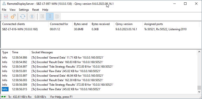 The Remote Display Server shows useful information on the Remote Display Controllers that are connected, for instance the IP address and host name of the remote computers and the used Qinsy version.