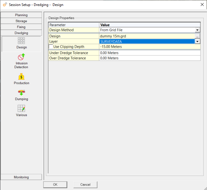 Other parameters can be entered online in the Session Setup Dredging pages.