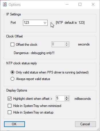 | Offset the clock | The time in the NTP reply can be offset with whole seconds for debug testing. Watch out, this is a dangerous option, leave at zero. |