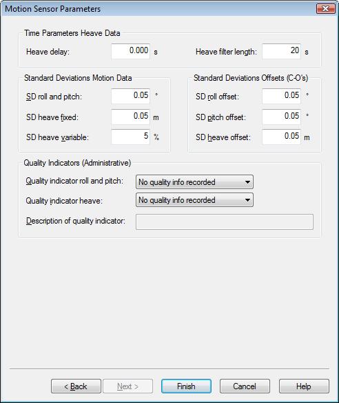 Enter a priori standard deviations for roll and pitch observations(default 0.05°). Heave observation, fixed part (default 0.05 m) and variable part(default 5%). Also a priori standard deviations for the alignment corrections or offsets (C-O’s) that have been defined on the previous page, i.e. roll offset(default 0.05°), pitch offset (default 0.05°) and heave offset (default 0.05 m). The accuracy of a heave observation is often expressed as e.g. “5 cm or 5%, whichever is highest”. The variable part will be higher if the swell is more than 1 m.