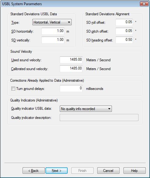 Enter a priori standard deviations for the USBL observations as either horizontal and vertical uncertainties (defaults 1 m and 1 m) or angle and range uncertainties (defaults 1° and 1 m). Also a priori standard deviations for the alignment corrections or offsets (C-O’s) that have been defined on the previous page, i.e. roll offset (default 0.05°), pitch offset (default 0.05°) and heading (yaw) offset (default 0.5°). The type of SD for the USBL observations best corresponds with the type of accuracy values that the USBL manufacturer has provided.