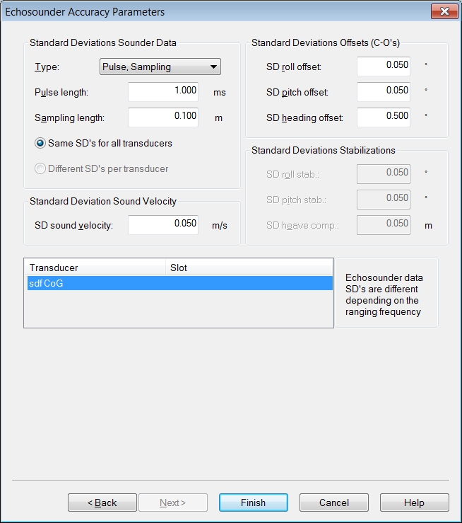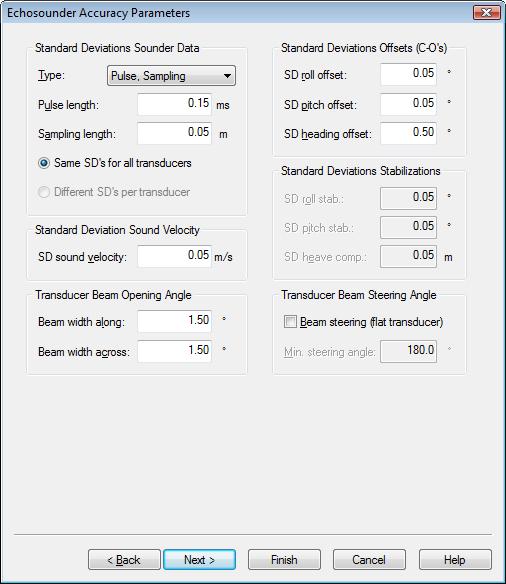 Enter a priori standard deviations for the MBE observations as either pulse length and range sampling length(defaults 0.15 ms and 0.05 m) or pulse length and range sampling frequency(defaults 0.15 ms and 14.85 kHz) or angle and range uncertainties(defaults 0.05° and 0.05 m). Range sampling length is determined by sound velocity as rs=c/2f, where f is the range sampling frequency. The type of SD for the echosounder data best corresponds with the type of accuracy values that the MBE manufacturer has provided. Only one transducer is supported.