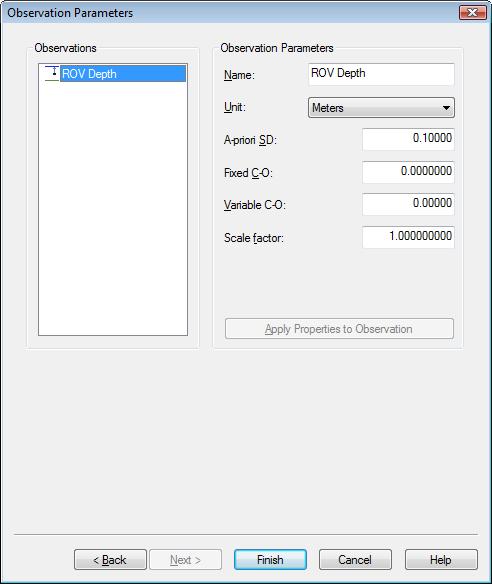 Enter a priori standard deviations for all the observations of surface navigation systems and underwater sensors, especially for ROV depth observations(default 0.1 m) and sound velocity observations (default 0.05 m/s).