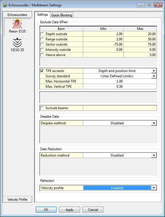 TPU values can be used as blocking parameters. Three options are available to exclude echosounder data, when (1) the vertical TPU exceeds the depth limit, (2) the horizontal TPU exceeds the position limit, or (3) the vertical TPU exceeds the depth limit or the horizontal TPU exceeds the position limit. The limits are obtained from two predefined survey standards, the IHO S-44 or the IMCA Guidelines. The actual limit values depend on the observed depths. It's also possible to choose User Defined Limits and enter the Maximum horizontal and vertical TPU value.