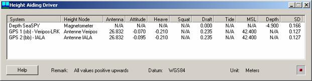 The Height Aiding driver computes a real-time standard deviation for each height aiding observation, using all uncertainty sources that contribute to the height uncertainty, i.e. dynamic draft (draft, load, squat), water level (tide gauge observation, tide file value, spatial/temporal prediction), depth observation, heave observation (fixed and variable components), induced heave (antenna offsets, pitch and roll observations), and MSL (depending on the geoid model; between 0.005 m and 0.2 m). For a vessel object, the height uncertainty will usually vary with the heave amplitude (swell).