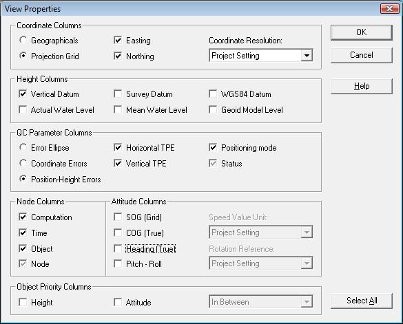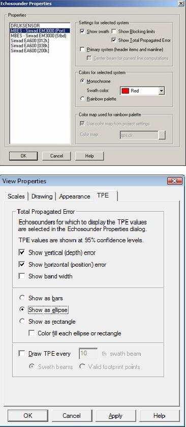 The TPU values for the echosounder transducer (and for all other nodes) can be displayed in a Node QC display by selecting the ‘Horizontal TPU’ and ‘Vertical TPU options’ under the ‘Position-Height Uncertainties ’ in the ‘View Properties’.