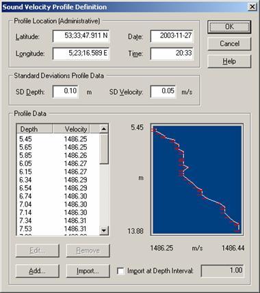 Enter a priori standard deviations for the depths(default 0.1 m) and velocities(default 0.05 m/s) in a profile, these values need to be entered in the database setup for the sound velocity profile.