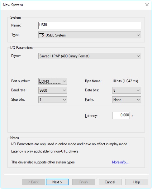 - Select the appropriate Driver for your USBL sytem and enter the I/O Parameters.
