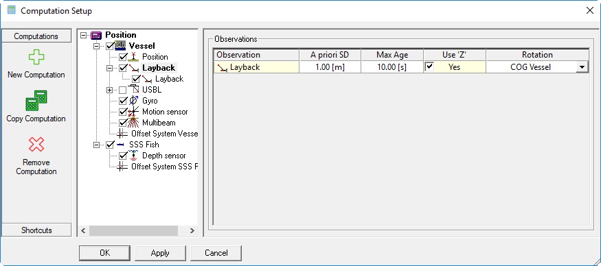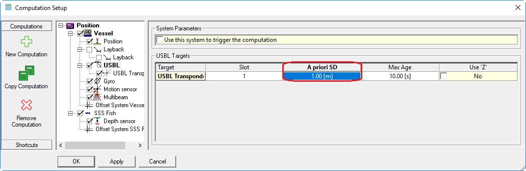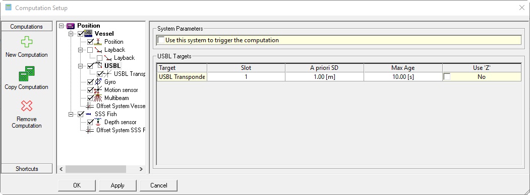 The Z value of the layback system or the USBL system will be used to calculate the height. - If a depth sensor needs to be used to calculate the height, disable the option Use 'Z' for the USBL system or the Layback system and select the Depth Sensor system in the computation tree.