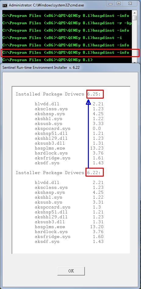 - When the driver is ready to use you can double check the version installed by typing haspdinst -info in the command line window.