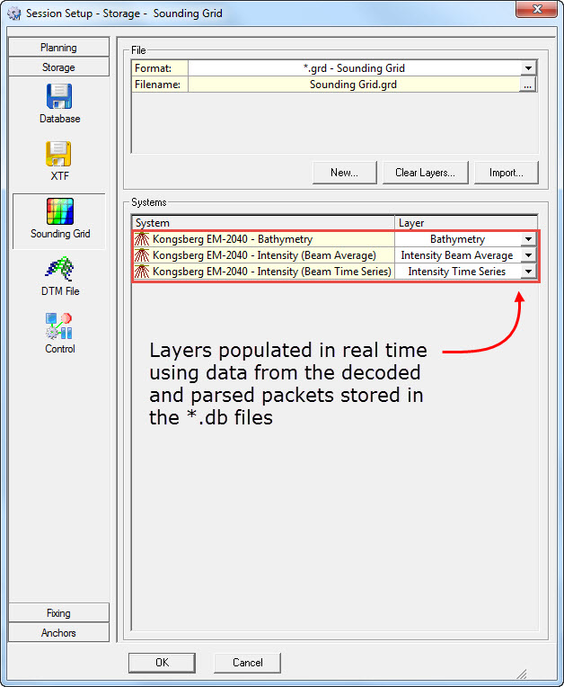 For real-time visualization of bathymetry and sonar imagery, or to produce a gridded dataset on-the-fly as end DTM product, ensure that the different data types are enabled and stored to separate layers in the sounding grid.