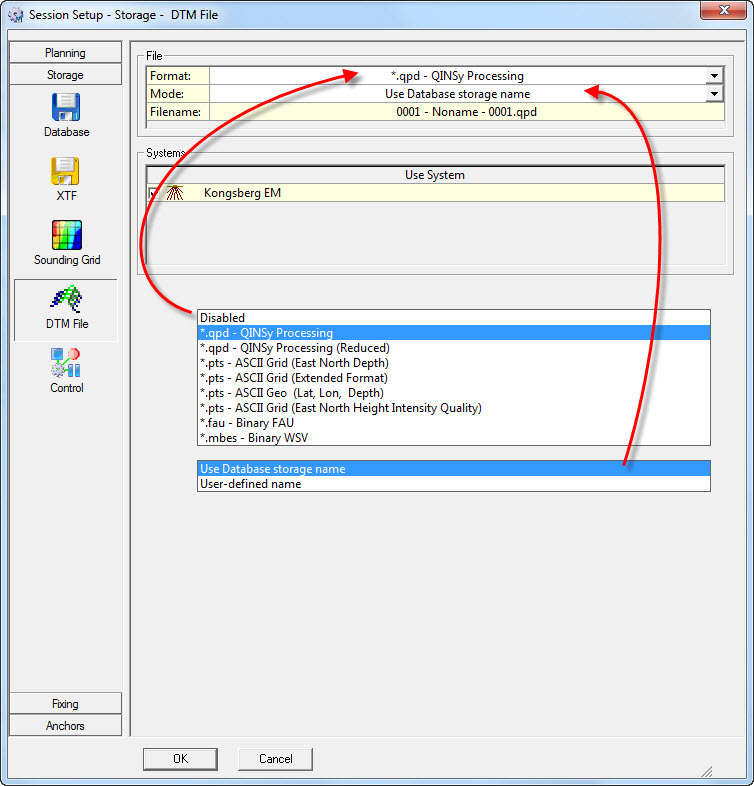 | Mode | The mode determines the name of the storage file: Use Storage name - The DTM file will have the same storage name as the raw data file. User-defined name - User is able to enter a different file name. |