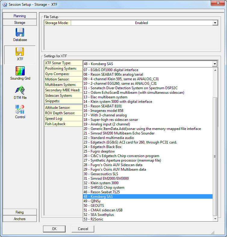 Click on 'Database'. At bottom right, sonar Storage Options are listed. Only those systems which were enabled in DbSetup while configuring the template database are shown here. If not shown, go back to DbSetup and check the Multibeam System definition.