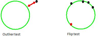 The outlier test computes the distance from a data point to the circle and rejects the point if the distance is larger than a limit that can be set by the user.